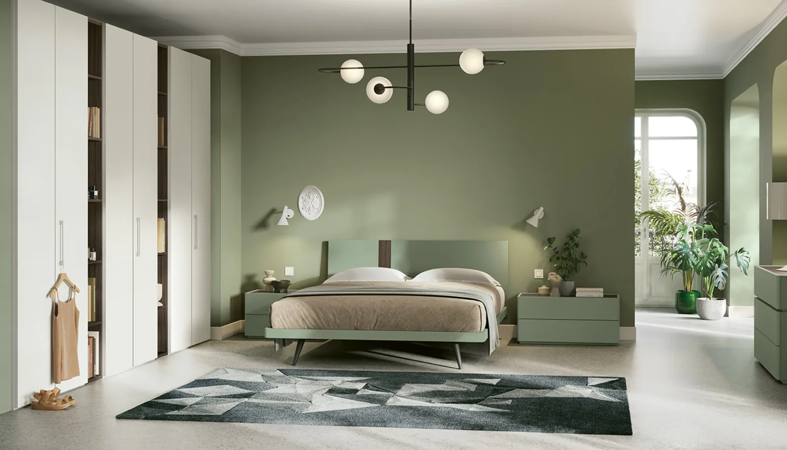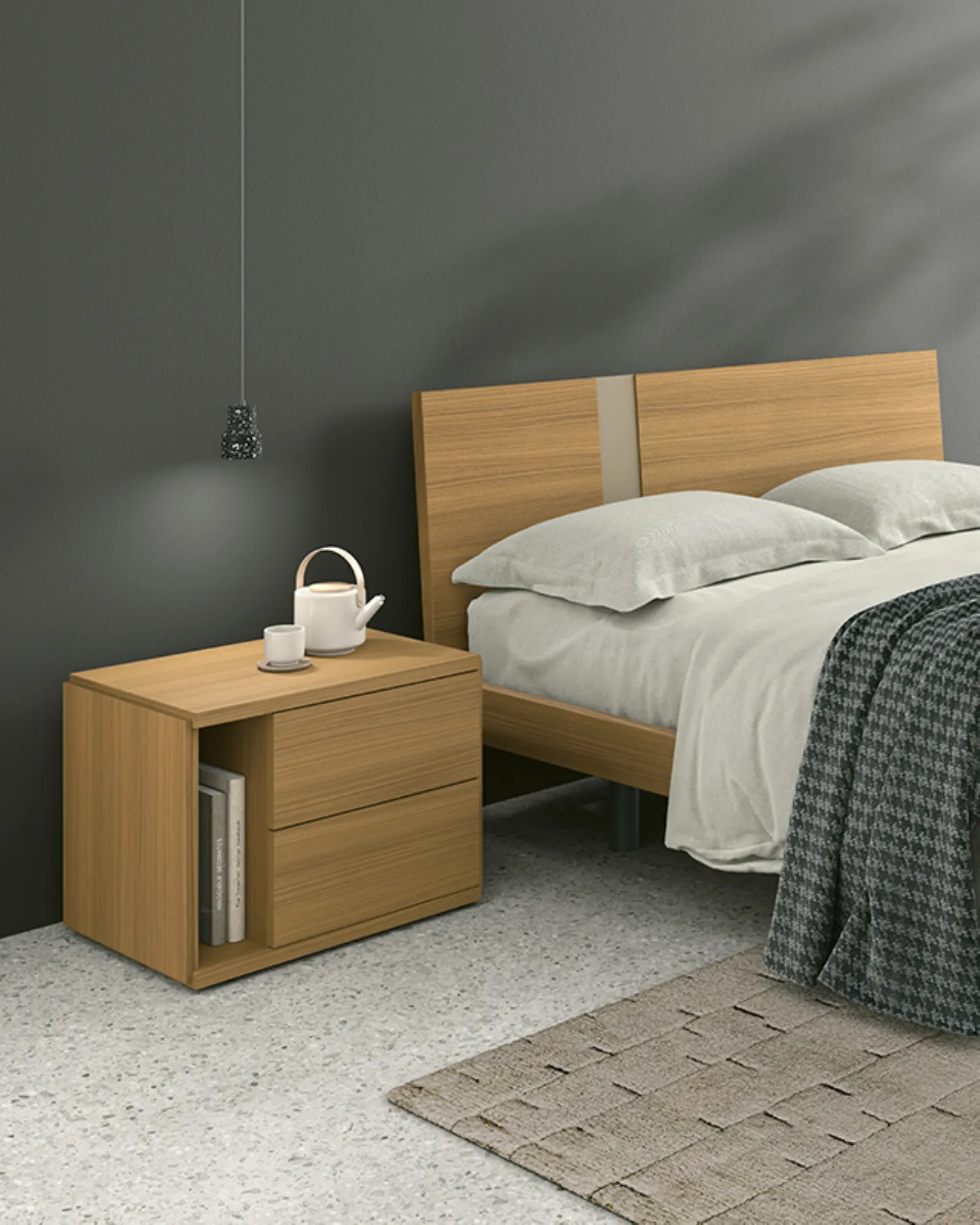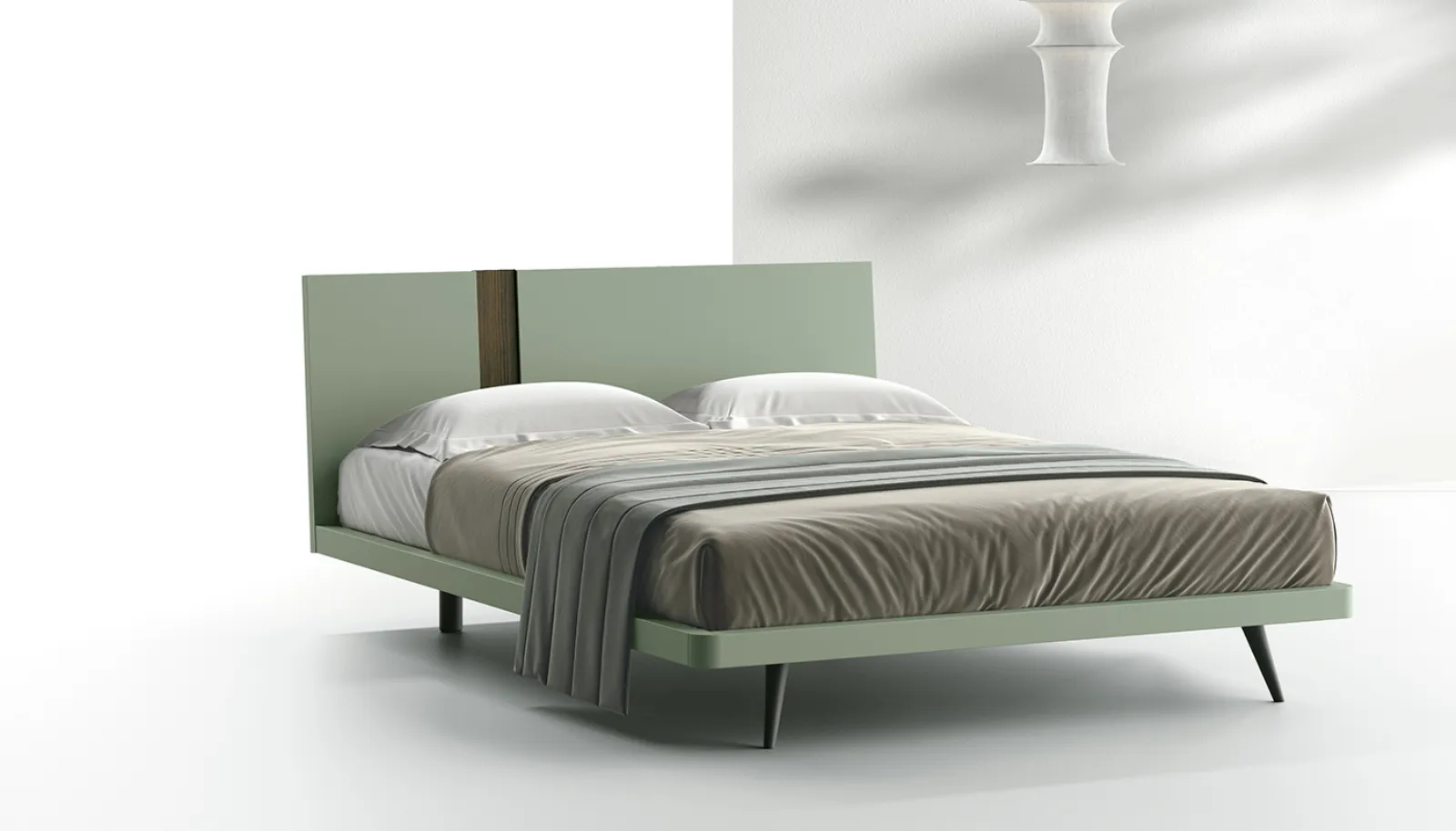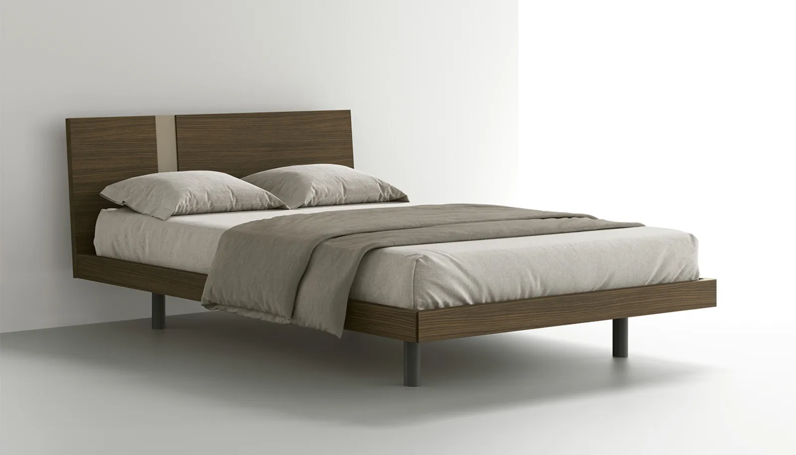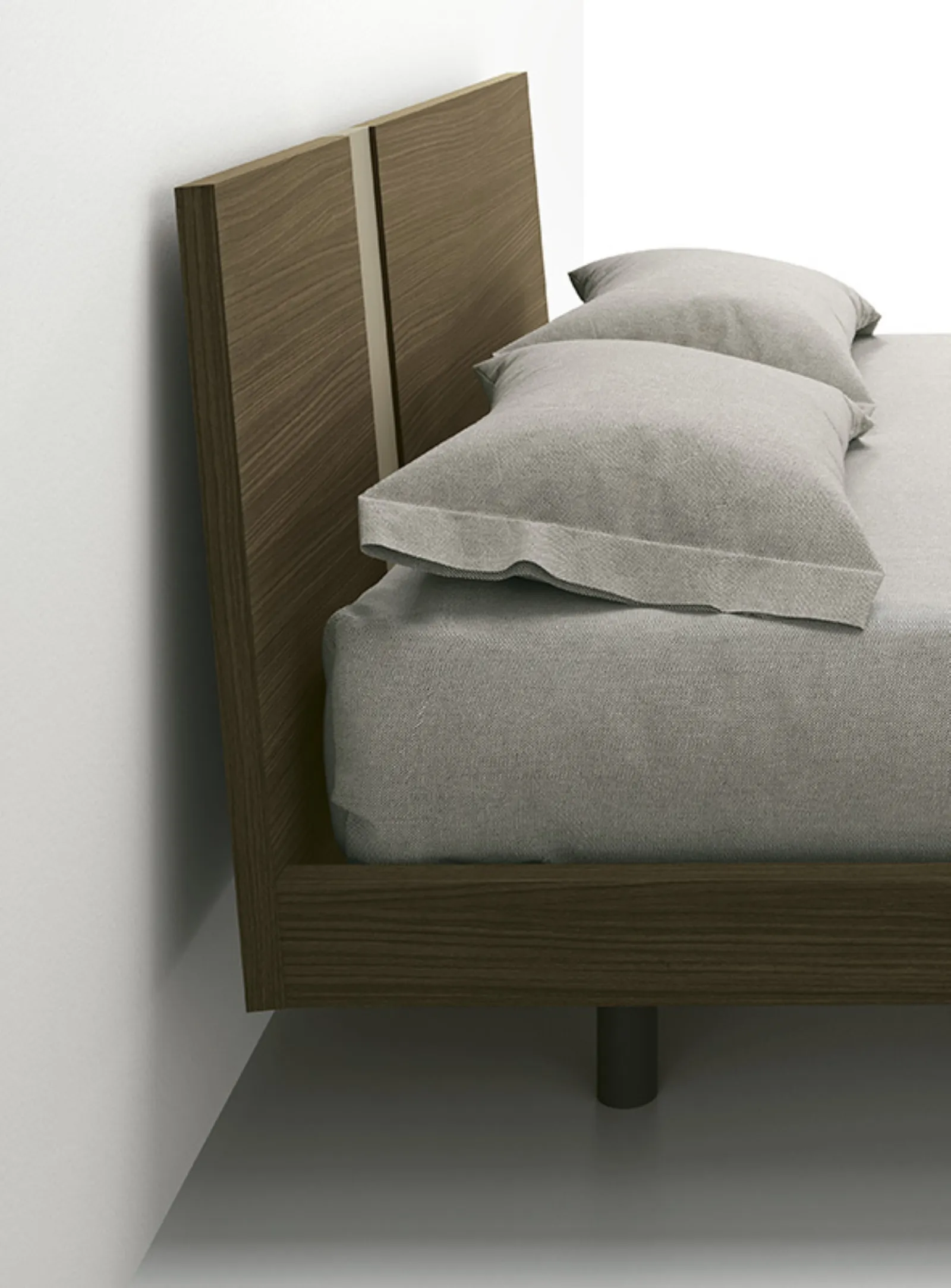 The Aphrodite bed designs the sleeping area with a strict yet balanced design, where symmetry is the main feature. The headboard, with a suspended profile, is made by combining panels of different thickness: the central section has a recess in the panel, creating a thin and refined demarcation line that accentuates the depth effect and the elegant layering of the material. The model's configuration is optimized for maximum flexibility: the Aphrodite headboard is available with three models of bed frames with legs. The dimensional options cover a wide range, being available for standard size beds ranging from 120 cm to 180 cm.